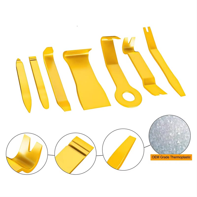 Auton koristeiden poistotyökalusarjamme sisältää kattavan sarjan keltaisia monitoimiklipsien poistotyökaluja, joista jokainen on valmistettu korkealaatuisista materiaaleista kestävyyden ja luotettavuuden varmistamiseksi. Nämä työkalut on suunniteltu helpottamaan erilaisten auton osien poistamista vahingoittamatta ajoneuvon pintaa. Ergonominen muotoilu ja tukeva rakenne tekevät niistä ihanteellisia sekä sisä- että ulkotilojen viimeistelytöihin, mikä takaa tehokkuuden ja helppokäyttöisyyden autoalan ammattilaisille.